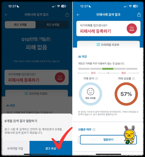 - 조회 결과가 ‘사기 이력 없음’으로 표시되면 비교적 안심할 수 있지만, 결과가 100% 안전을 보장하지는 않습니다. 더 많은 정보가 필요하다면, 광고 시청 후 무료 조회를 통해 추가 정보를 얻을 수 있습니다.