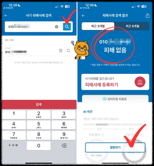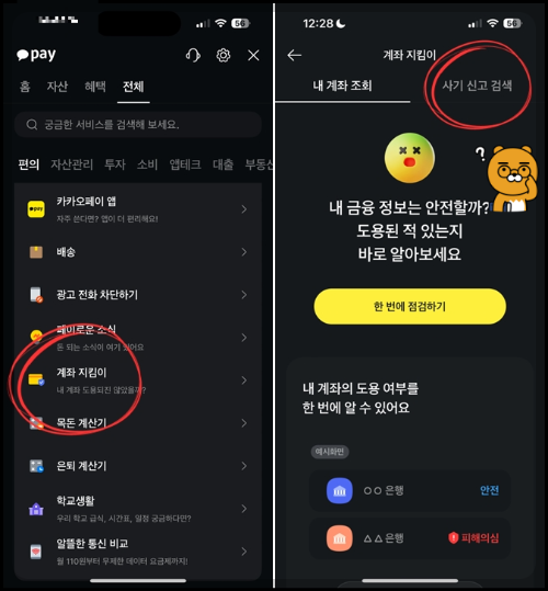 - '계좌 지킴이' 화면에서 '사기 신고 검색' 탭을 선택합니다. 거래 상대방의 계좌번호나 전화번호를 입력하고 조회 버튼을 눌러 사기 이력을 확인합니다. 📍 이러한 과정을 통해 더치트와 함께 카카오페이를 활용하여 거래 상대방의 신뢰도를 이중으로 확인함으로써 안전한 거래를 진행할 수 있습니다.