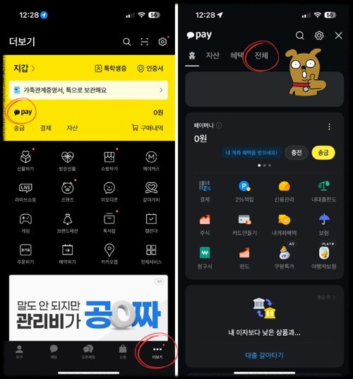 - 스마트폰에서 카카오톡 앱을 실행한 후, 하단의 '더보기' 메뉴(점 세 개 아이콘)를 선택합니다. 상단의 'PAY' 아이콘을 눌러 카카오페이 화면으로 이동합니다.