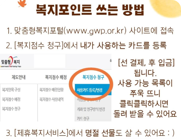 - 신한, 삼성, 국민 등 제휴된 카드사에서 발급받은 복지카드를 통해 포인트를 사용해보세요. 포털에서 간편하게 발급받을 수 있어요.