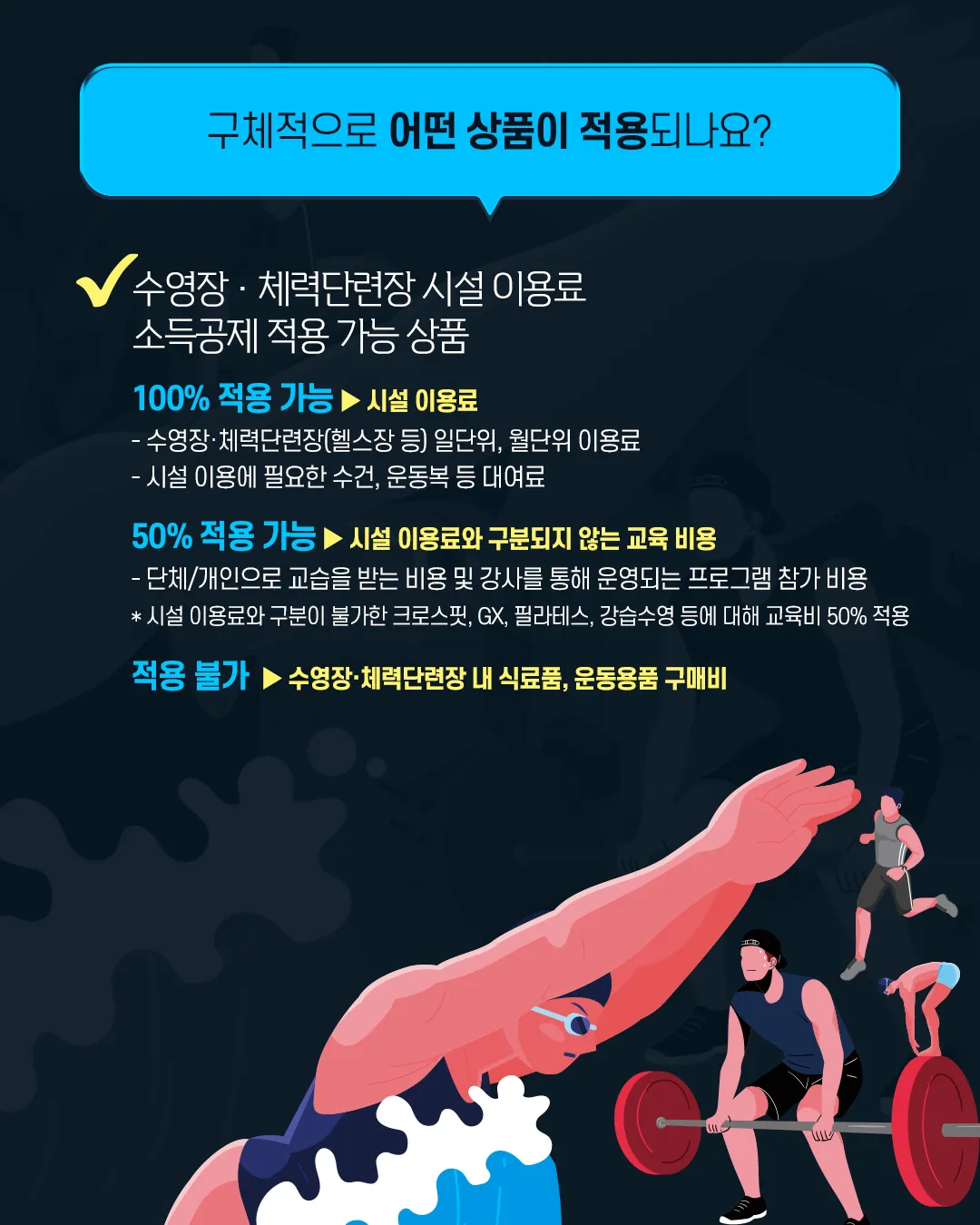 - ✅ 공제율: 헬스장, 수영장 등 체육시설 이용료 30% 공제