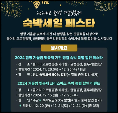 멀리서 오시는 분들을 위한 숙박 할인 이벤트가 진행됩니다. 최대 50% 할인 혜택을 활용해 여유로운 함평 겨울 빛 축제를 즐겨보세요!